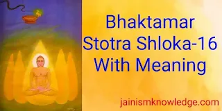 भक्तामर स्तोत्र जैन धर्म का महान प्रभावशाली स्तोत्र है । इस स्तोत्र की रचना आचार्य मानतुंग ने की थी । इस स्तोत्र की रचना संस्कृत भाषा में हुई थी , जो इस स्तोत्र की मूल भाषा है, परन्तु यदी आपको संस्कृत नही आती तो आपकी सुविधा के लिए Bhaktamar Stotra के श्र्लोको (Shloka) को हमने मूल अर्थ के साथ - साथ हिन्दी में अनुवादित करते हुये उसका अर्थ भी दिया है , साथ हि साथ जिन लोगो को English आती है और संस्कृत नही पढ सकते वह सधार्मिक बंधु भी English मे Bhaktamar stotra का पाठ कर सकते है । इस प्रकार से Bhaktamar Stotra Shloka-16 With Meaning की सहायता से आप आसानी से इस स्तोत्र का पाठ कर सकते है ।